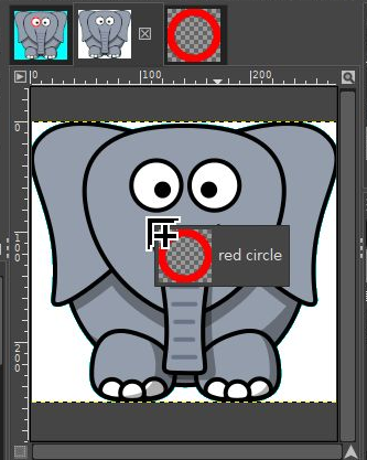 如下圖所示,將 red circle 圖層拖曳至白底的大象圖案上, 此時尚未放開滑鼠左鍵。
